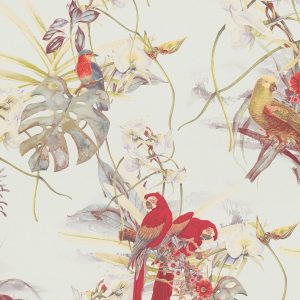 Estilo: Papel pintado diseño de loros sobre hojas de selva tropical en color crema y rojo.