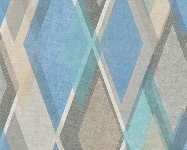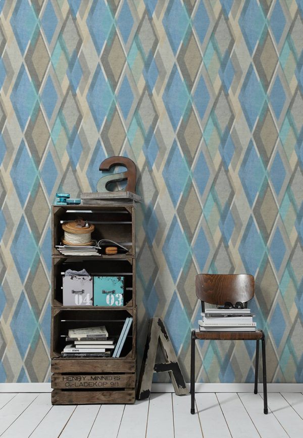 Papel pintado geométricos con rombos en tonos azules y grises.