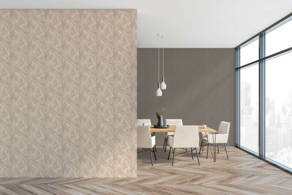 Papel pintado geométrico efecto madera natural clara con detalles metalizados. Medidas: 10,05 m x 0,53 m. Case: 64 / 32 cm (case salteado). Calidad: Tejido no Tejido. Estilo: Texturas naturales. Geométrico/Rayas.