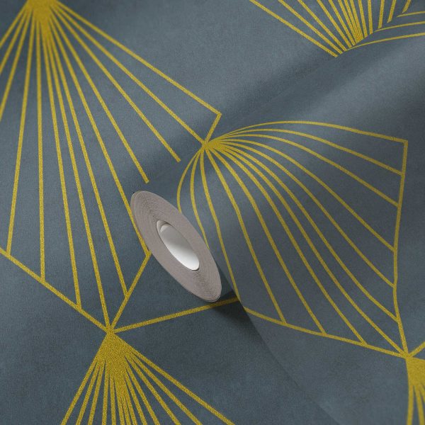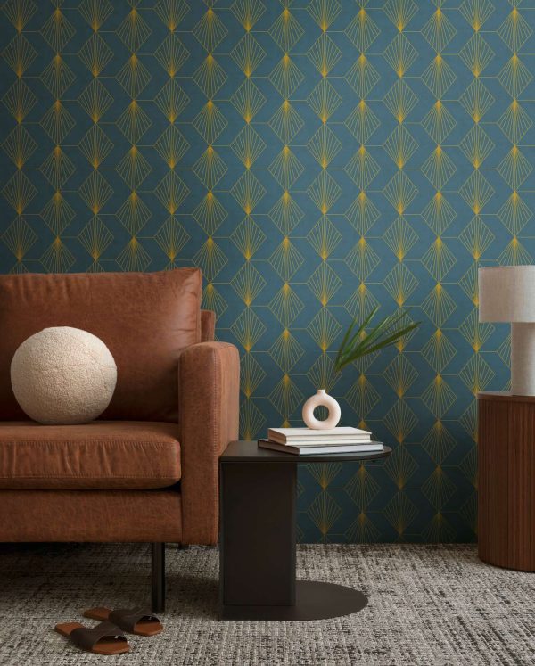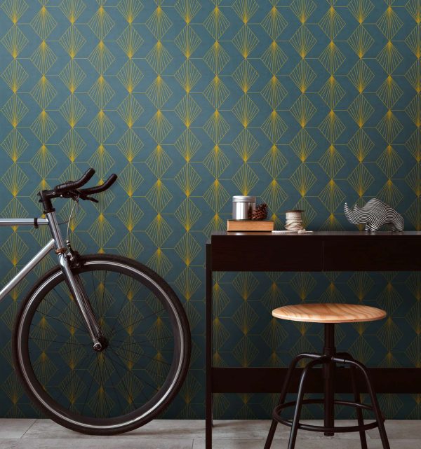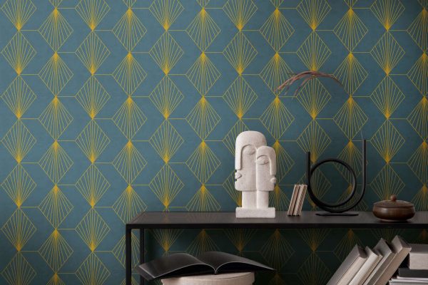 Medidas: 10,05 m x 0,53 m. Case: 16 cm (straight match-case recto). Calidad: Tejido no tejido. Estilo: Papel pintado con motivos geométricos dorados estilo Art Decò con fondo azul petróleo.