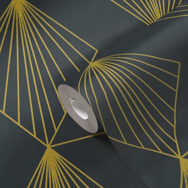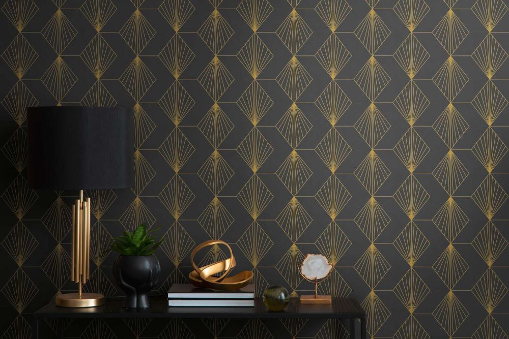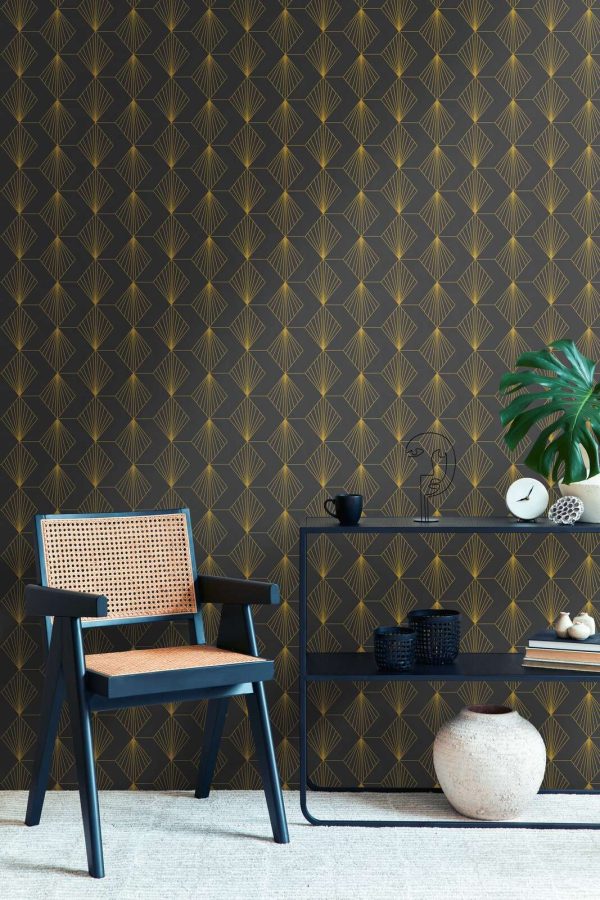 Medidas: 10,05 m x 0,53 m. Case: 16 cm (straight match-case recto). Calidad: Tejido no tejido. Estilo: Papel pintado con motivos geométricos dorados estilo Art Decò con fondo negro.