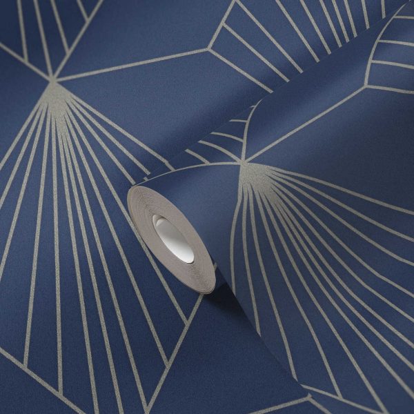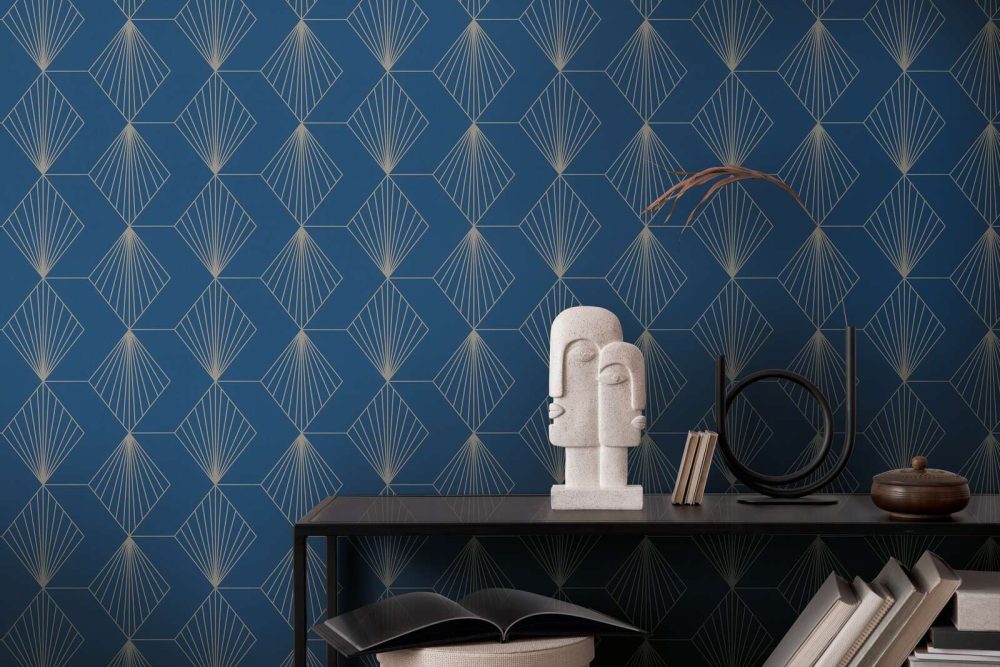 Medidas: 10,05 m x 0,53 m. Case: 16 cm (straight match-case recto). Calidad: Tejido no tejido. Estilo: Papel pintado con motivos geométricos dorados estilo Art Decò con fondo azul marino.