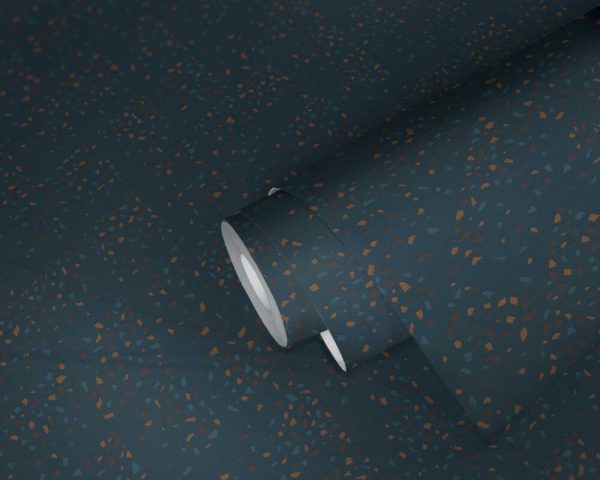 Medidas: 10,05 m x 0,53 m. Case: 64 / 32 cm (offset match). Calidad: Tejido no tejido. Estilo: Papel pintado geométrico diseño de terrazo en color azul con detalles en beige.