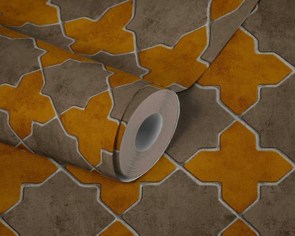 Medidas: 10,05 m x 0,53 m. Case: 53 / 18 cm (offset match). Calidad: Tejido no tejido. Estilo: Papel pintado geométrico diseño azulejo en color amarillo y marrón.