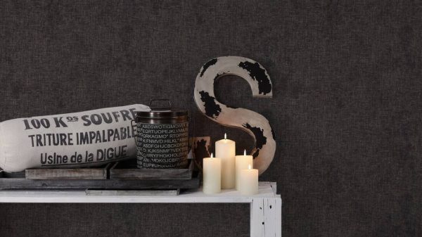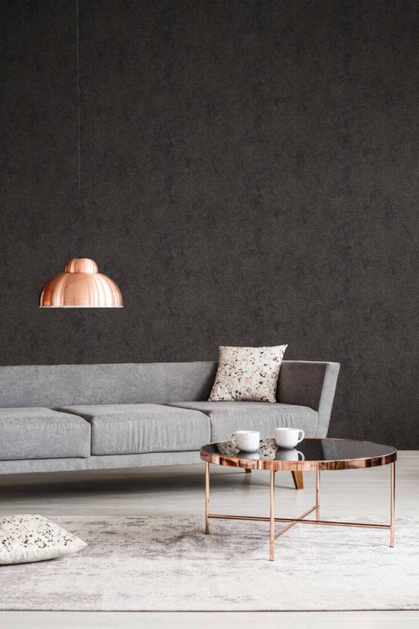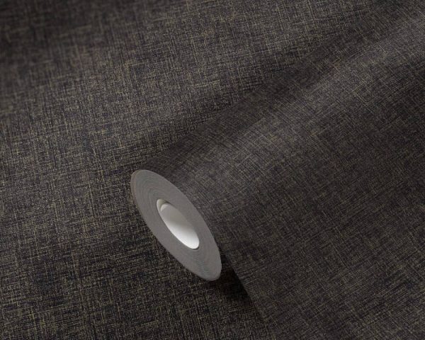 Medidas: 10,05 m x 0,53 m. Case: Sin case. Calidad: Tejido no tejido. Estilo: Papel pintado liso aspecto lino color negro con detalles dorados.