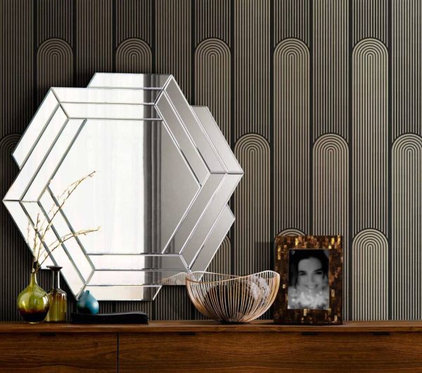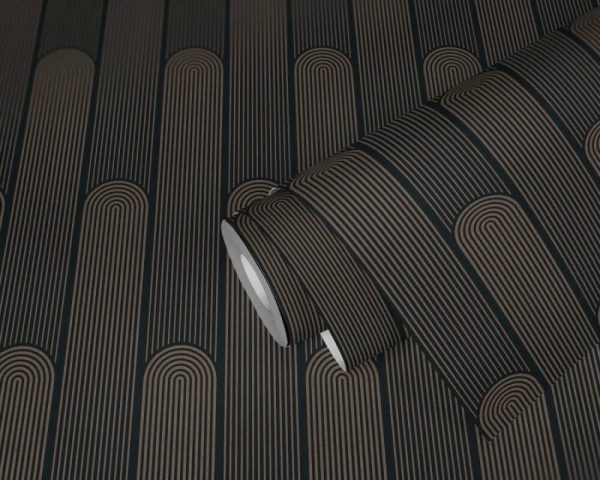 Medidas: 10,05 m x 0,53 m. Case: 32 cm (straight match). Calidad: Tejido no tejido. Estilo: Papel pintado geométrico arcos estilo Art-Deco en color negro.