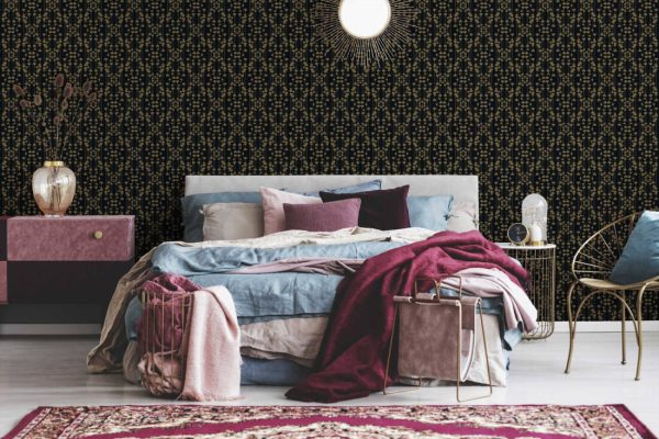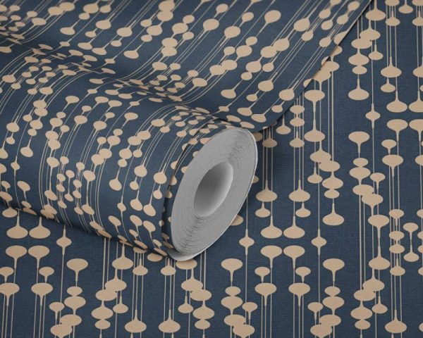 Medidas: 10,05 m x 0,53 m. Case: 32 cm (straight match). Calidad: Tejido no tejido. Estilo: Papel pintado diseño geométrico de gotas en color negro y dorado.