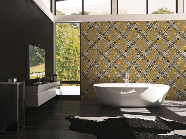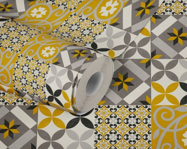 Medidas: 10,05 m x 0,53 m. Case: 53 cm (straight match). Calidad: Tejido no tejido. Estilo: Papel pintado azulejo estilo hidráulico en color amarillo mostaza/negro.