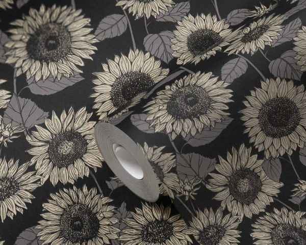 Medidas: 10,05 m x 0,53 m. Case: 64 / 32 cm (offset match). Calidad: Tejido no tejido. Estilo: Papel pintado floral de girasoles en color negro/gris.