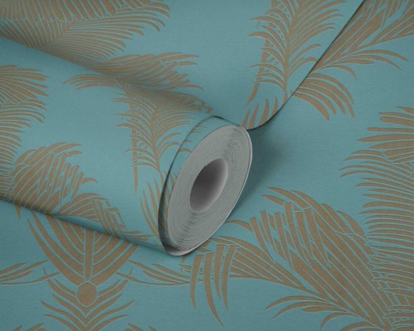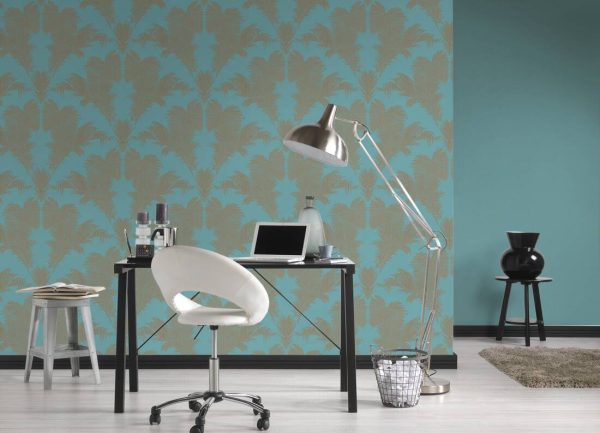 Medidas: 10,05 m x 0,53 m. Case: 64 / 32 cm (offset match). Calidad: Tejido no tejido. Estilo: Papel pintado plumas estilo Art-Deco en color verde turquesa con efecto metalizado.