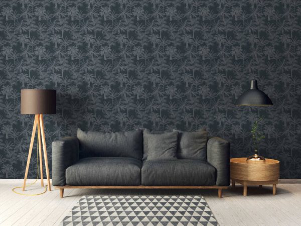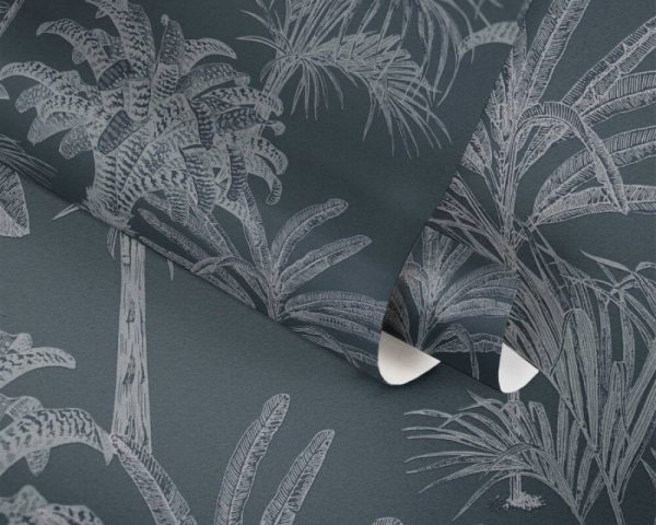 Medidas: 10,05 m x 0,53 m. Case: 64 cm (straight match). Calidad: Tejido no tejido. Estilo: Papel pintado palmeras estilo tropical en color negro.