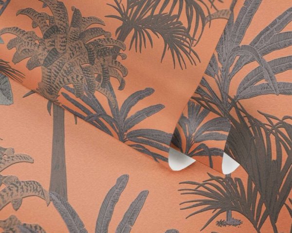 Medidas: 10,05 m x 0,53 m. Case: 64 cm (straight match). Calidad: Tejido no tejido. Estilo: Papel pintado palmeras estilo tropical en color naranja.