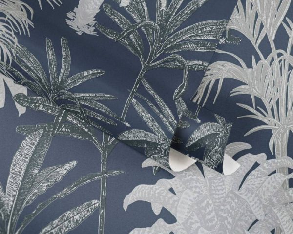 Medidas: 10,05 m x 0,53 m. Case: 64 cm (straight match). Calidad: Tejido no tejido. Estilo: Papel pintado palmeras estilo tropical en color azul marino.