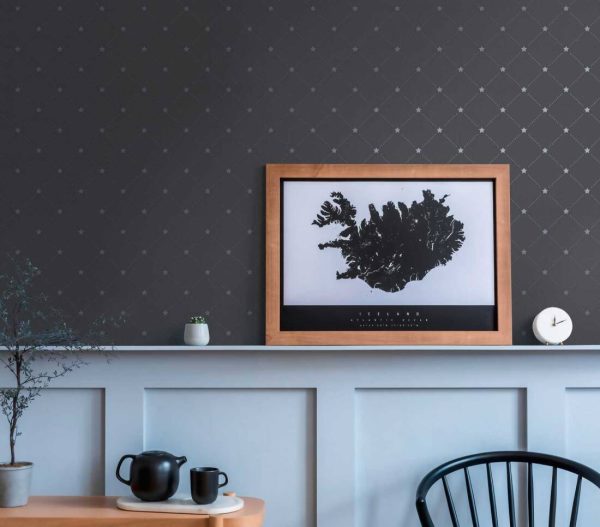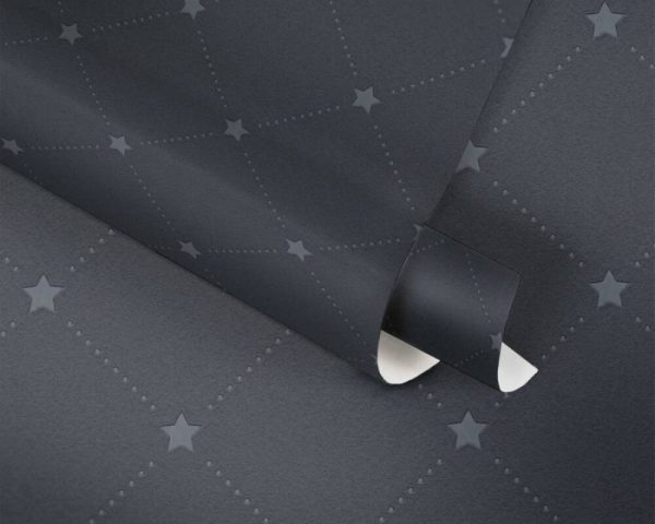 Medidas: 10,05 m x 0,53 m. Case: 13 cm (straight match). Calidad: Tejido no tejido. Estilo: Papel pintado geométrico de estrellas en color negro.