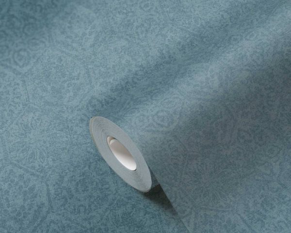 Medidas: 10,05 m x 0,53 m. Case: 64 cm (straight match). Calidad: Tejido no tejido. Estilo: Papel pintado geométrico con ornamentos de estilo barroco en color azul.