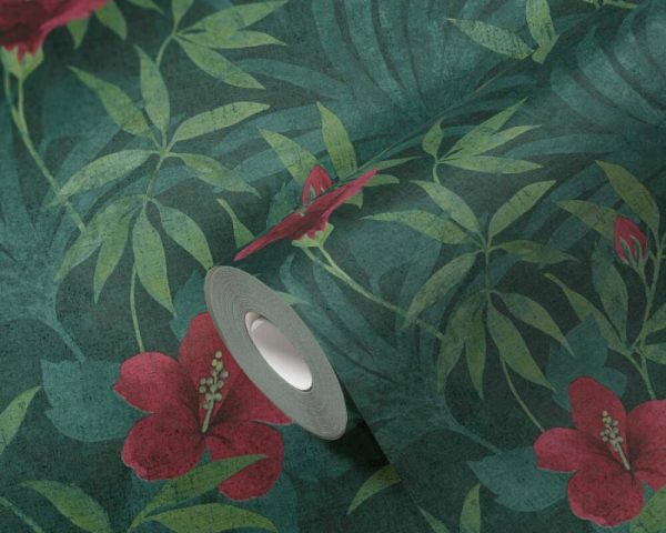 Medidas: 10,05 m x 0,53 m. Case: 64 / 32 cm (offset match). Calidad: Tejido no tejido. Estilo: Papel pintado estilo floral en color verde y rojo.