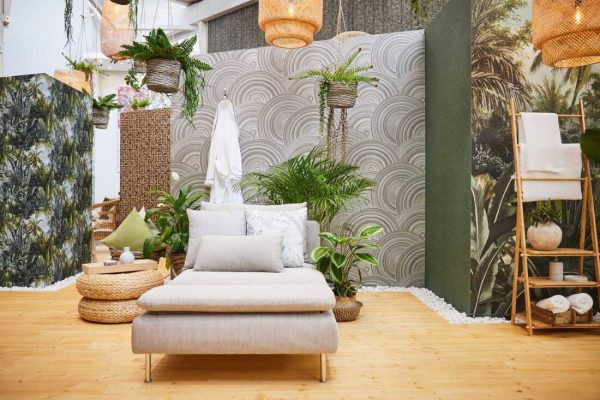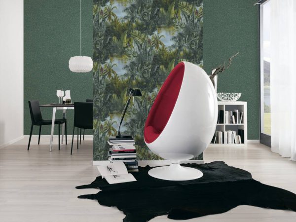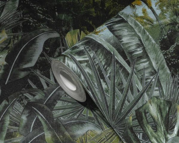 Medidas: 10,05 m x 0,53 m. Case: 64 / 32 cm (offset match). Calidad: Tejido no tejido. Estilo: Papel pintado diseño tropical estilo vintage en color verde/azul.