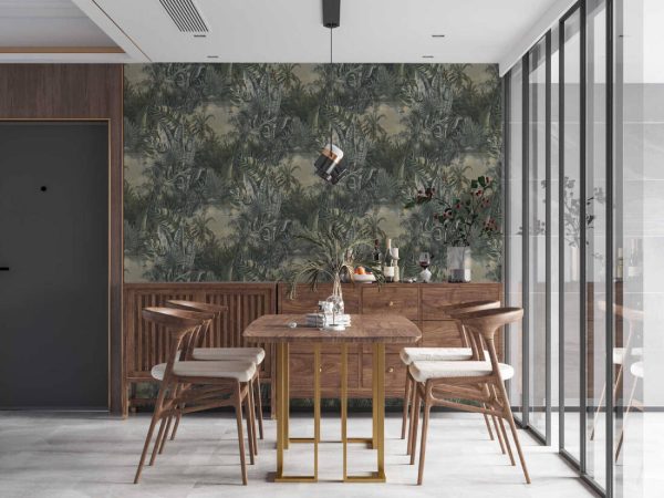 Medidas: 10,05 m x 0,53 m. Case: 64 / 32 cm (offset match). Calidad: Tejido no tejido. Estilo: Papel pintado diseño tropical estilo vintage en color verde/gris.