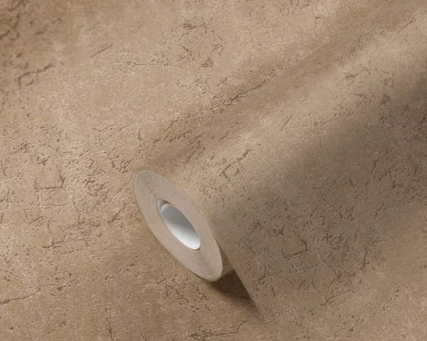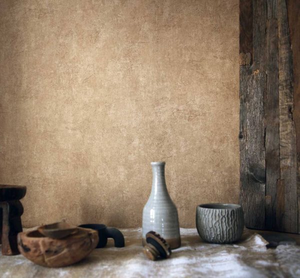 Estilo: Papel pintado efecto yeso-cemento en color marrón/beige.