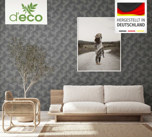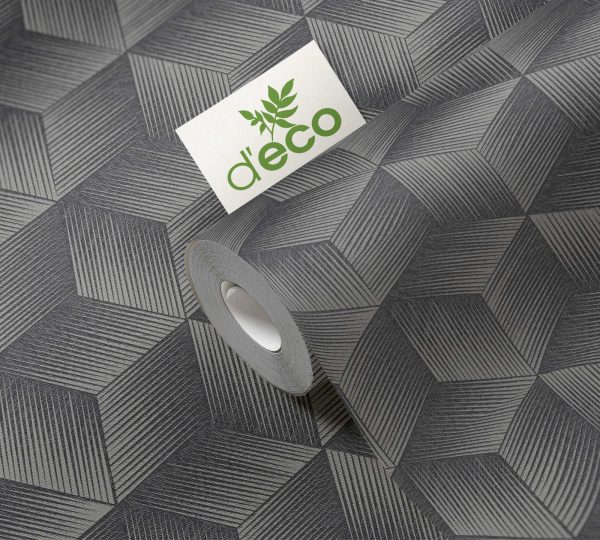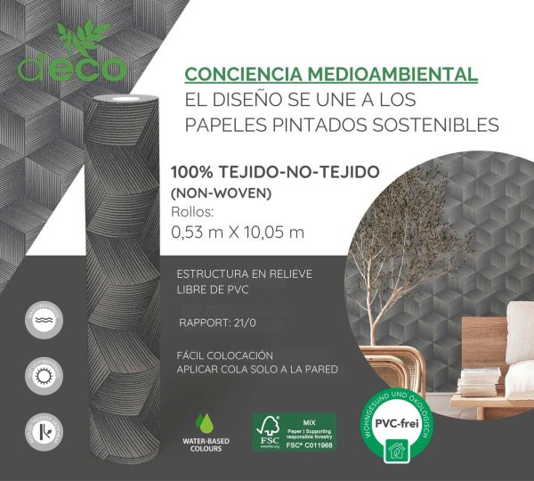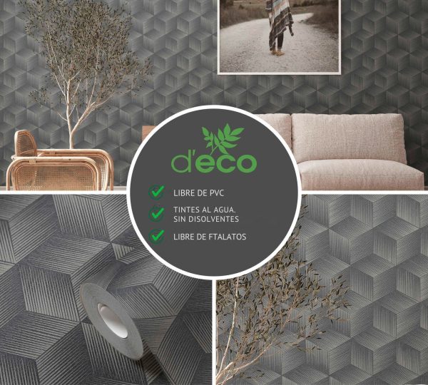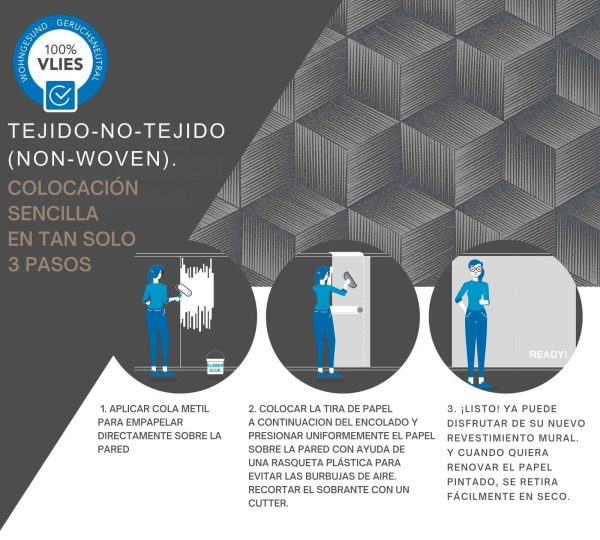 Medidas: 10,05 m x 0,53 m. Case: 64/0 cm (case libre). Calidad: Tejido no tejido. Estilo: papel pintado cubos efecto 3D en color negro y gris.