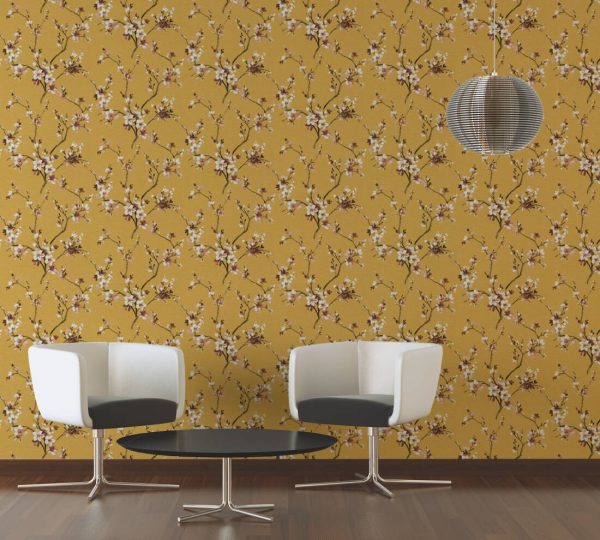 Medidas: 10,05 m x 0,53 m. Case: 53 / 26 cm (offset match). Calidad: Tejido no tejido. Estilo: Papel pintado diseño flor de cerezo en color amarillo mostaza.