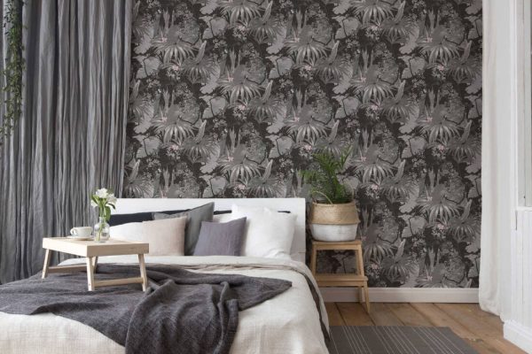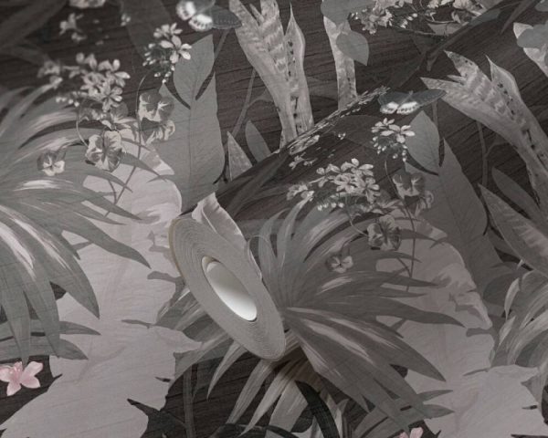 Medidas: 10,05 m x 0,53 m. Case: 64 / 32 cm (offset match). Calidad: Tejido no tejido. Estilo: Papel pintado diseño selva tropical efecto vintage en color negro/gris.