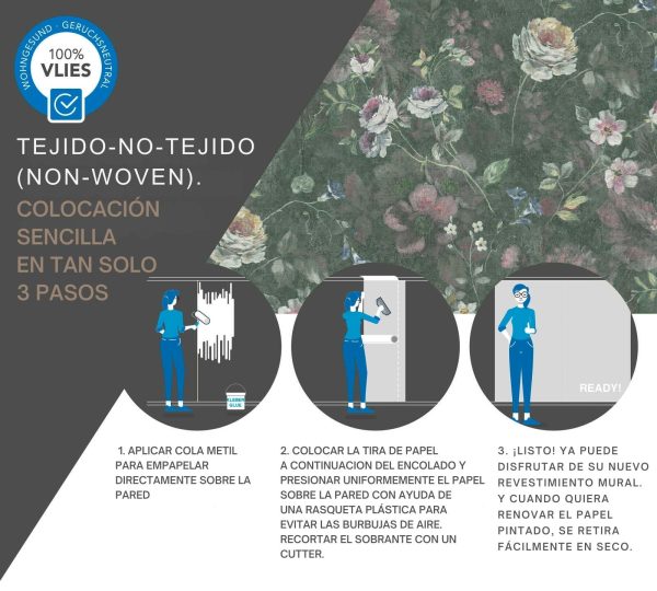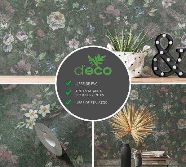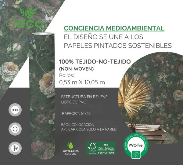 Medidas: 10,05 m x 0,53 m. Case: 64/32 cm (offset match). Calidad: Tejido no tejido. Estilo: papel pintado flores en color verde, rojo, crema y amarilo.