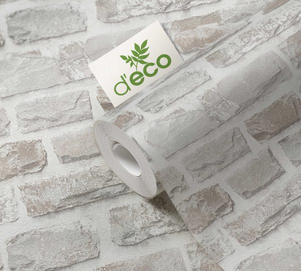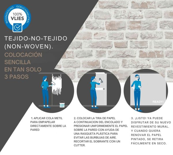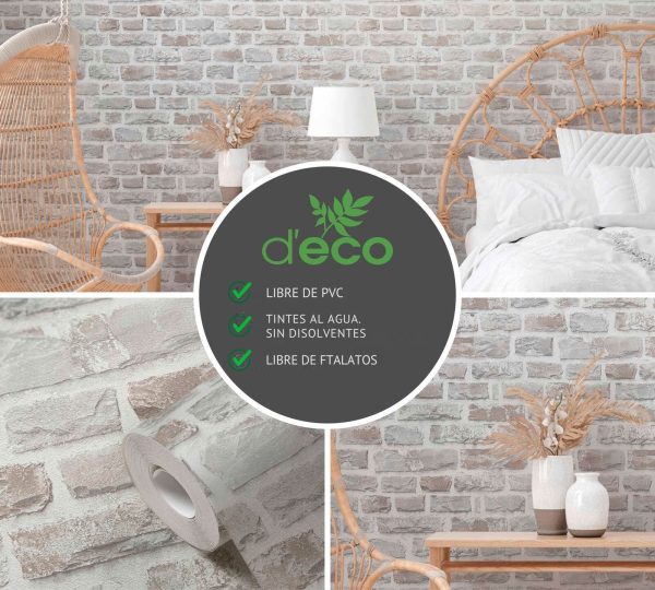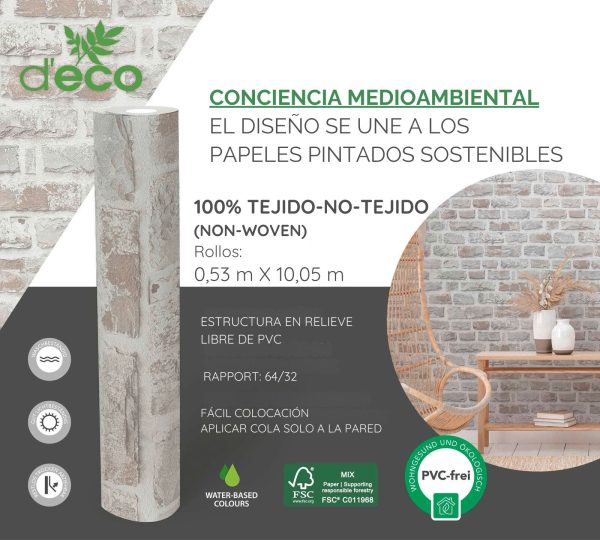 Medidas: 10,05 m x 0,53 m. Case: 64/32 cm (offset match). Calidad: Tejido no tejido. Estilo: papel pintado efecto ladrillo en color beige, gris y blanco.