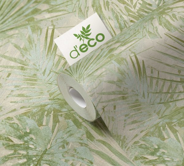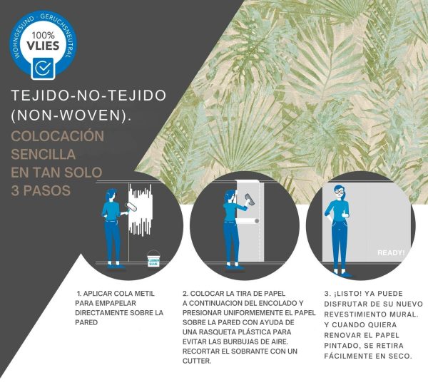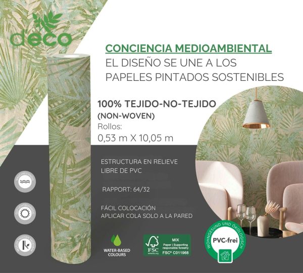 Medidas: 10,05 m x 0,53 m. Case: 64/32 cm (offset match). Calidad: Tejido no tejido. Estilo: Papel pintado palmeras. Estilo Floral. En color verde, beige y crema.