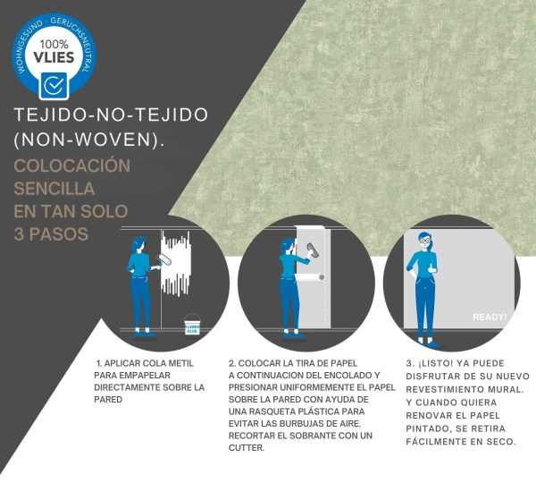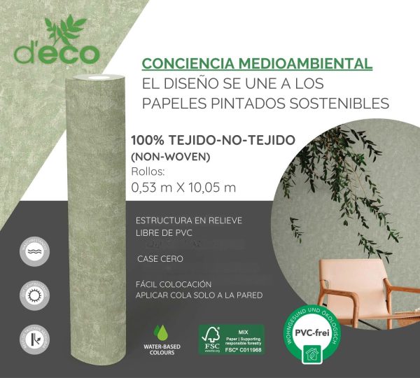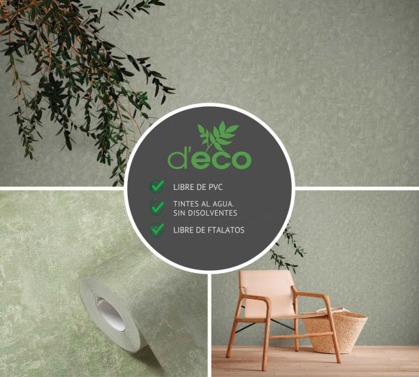 Medidas: 10,05 m x 0,53 m. Case: Sin case. Calidad: Tejido no tejido. Estilo: Papel pintado liso efecto hormigón en color verde.