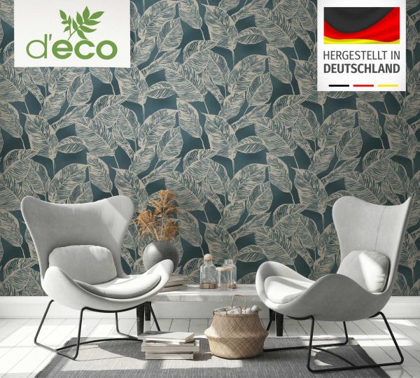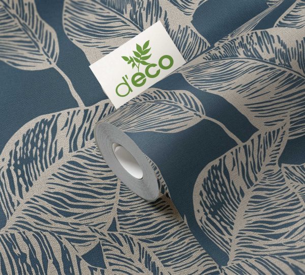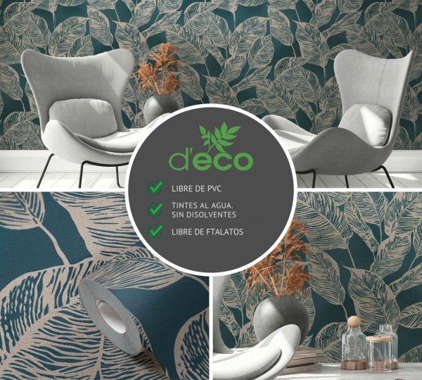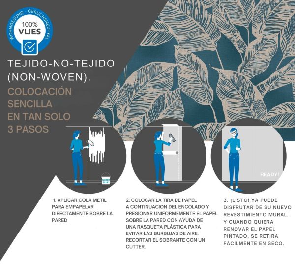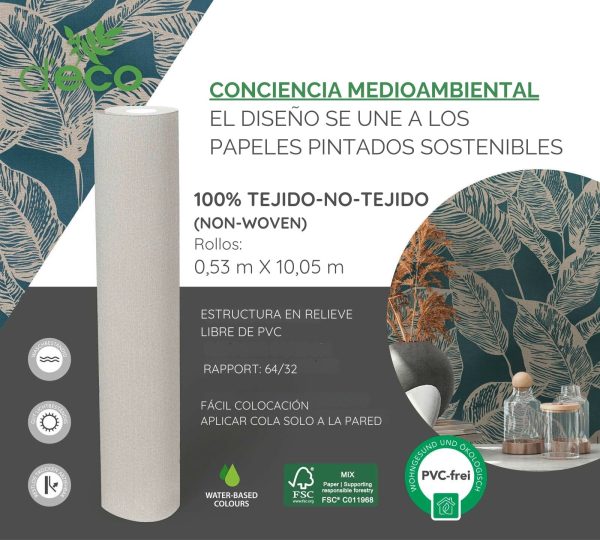 Medidas: 10,05 m x 0,53 m. Case: 64/32 cm (offset match). Calidad: Tejido no tejido. Estilo: Papel pintado hojas. Estilo Floral. En color azul y beige.