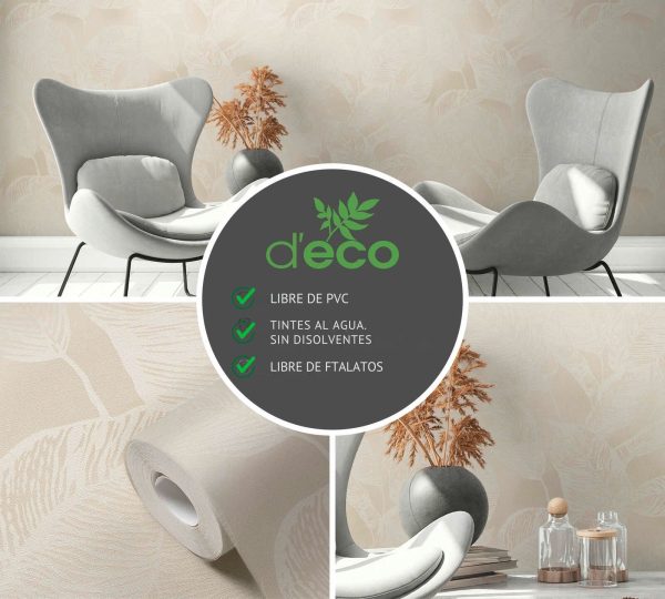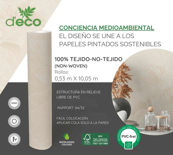 Medidas: 10,05 m x 0,53 m. Case: 64/32 cm (offset match). Calidad: Tejido no tejido. Estilo: Papel pintado hojas. Estilo Floral. En color beige y crema.
