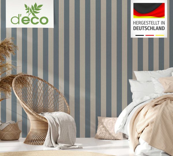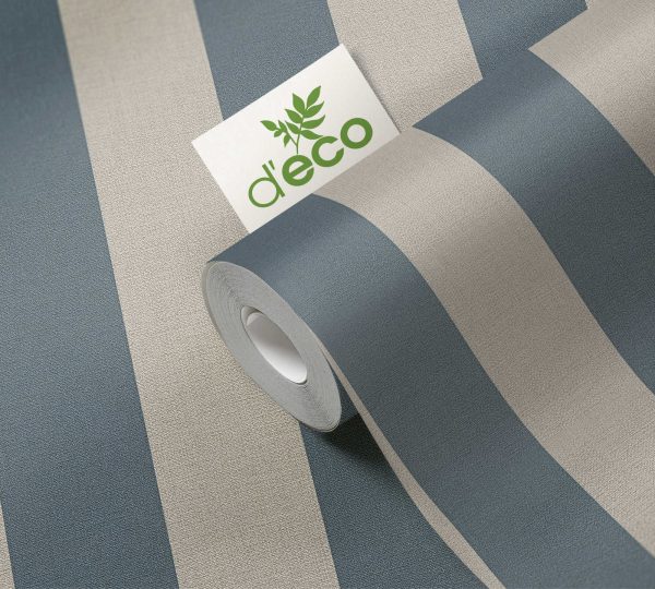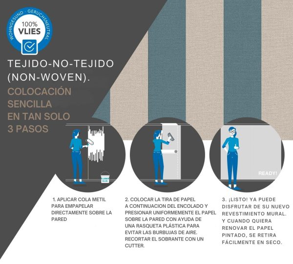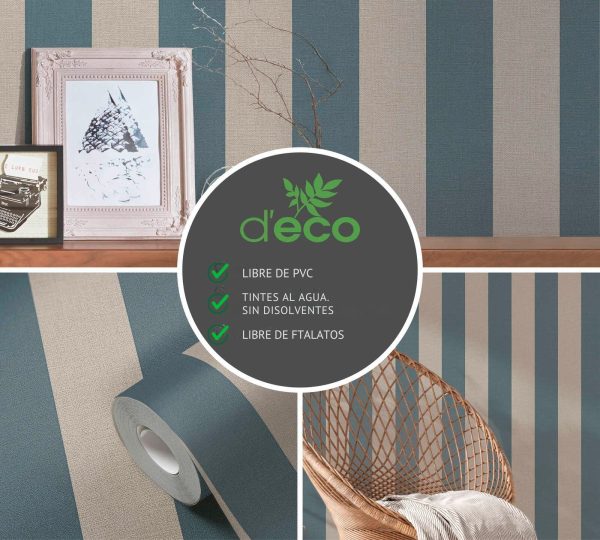 Medidas: 10,05 m x 0,53 m. Case: Sin case. Calidad: Tejido no tejido. Estilo: papel pintado rayas en color azul y beige.