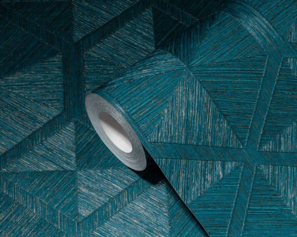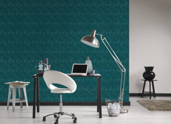 Medidas: 10,05 m x 0,53 m. Case: 21 cm (straight match). Calidad: Tejido no tejido. Estilo: Papel pintado geométrico en color azul turquesa efecto nacarado.