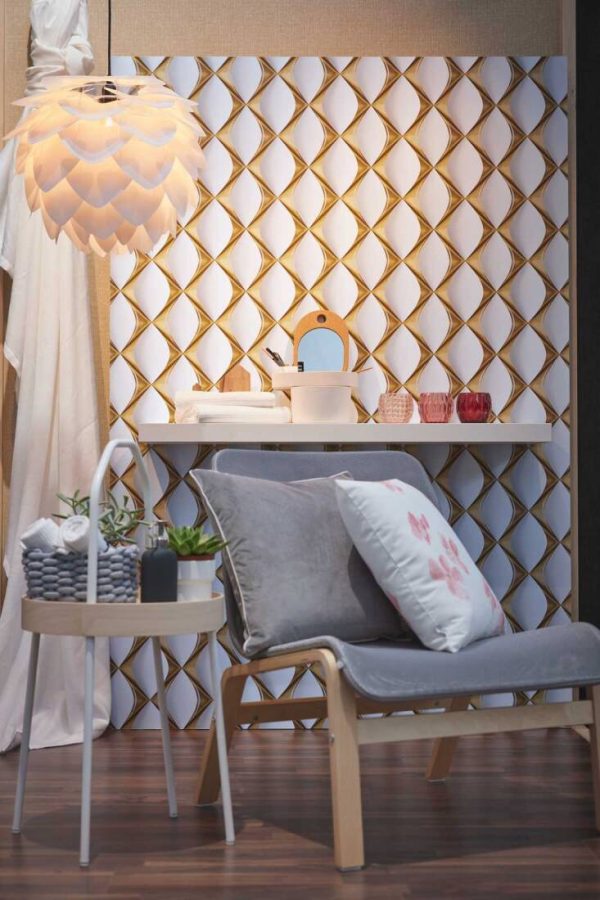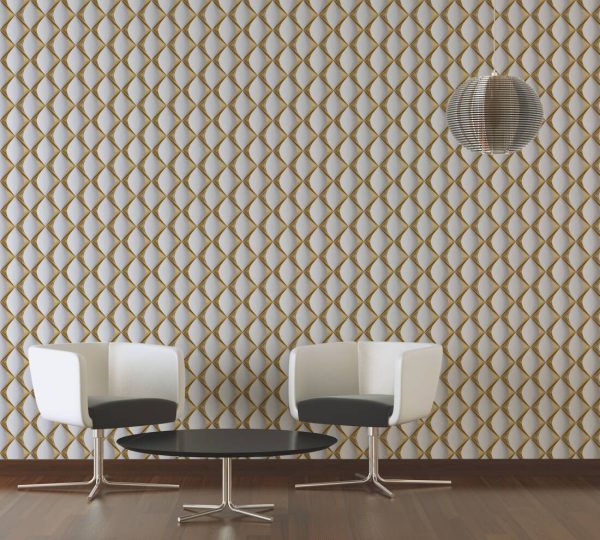 Medidas: 10,05 m x 0,53 m. Case: 18 cm (straight match). Calidad: Tejido no tejido. Estilo: Papel pintado geométrico efecto baldosa diseño Art-Deco en color blanco y dorado.