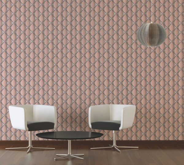Medidas: 10,05 m x 0,53 m. Case: 18 cm (straight match). Calidad: Tejido no tejido. Estilo: Papel pintado geométrico efecto baldosa diseño Art-Deco en color rosa y plata.