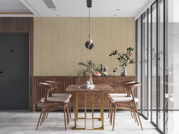Medidas: 10,05 m x 0,53 m. Case: 64 cm (straight match). Calidad: Tejido no tejido. Estilo: Papel pintado geométrico diseño espiga en color beige con detalles metalizados.