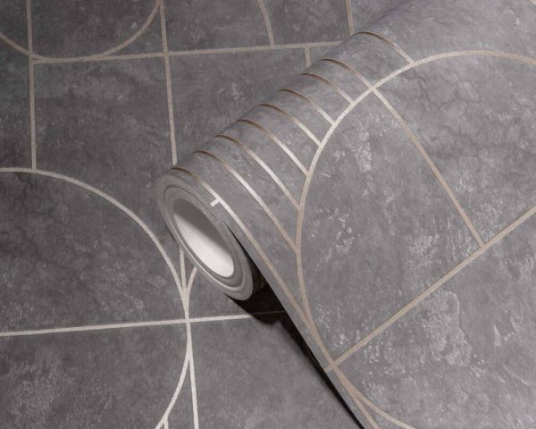Medidas: 10,05 m x 0,53 m. Case: 64 / 32 cm (offset match). Calidad: Tejido no tejido. Estilo: Papel pintado geométrico diseño Art-Deco en color gris con detalles metalizados.