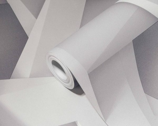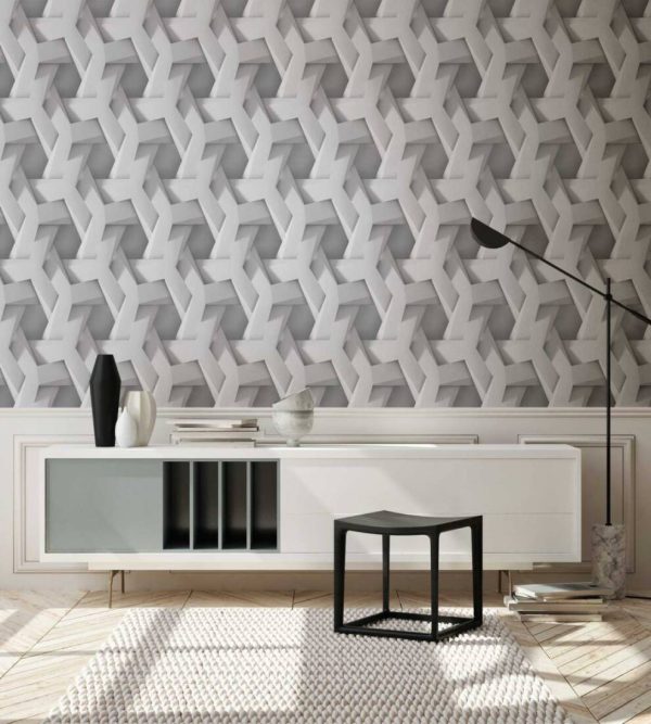Medidas: 10,05 m x 0,53 m. Case: 64 cm (straight match). Calidad: Tejido no tejido. Estilo: Papel pintado patrón geométrico efecto 3D en color gris/crema.