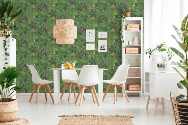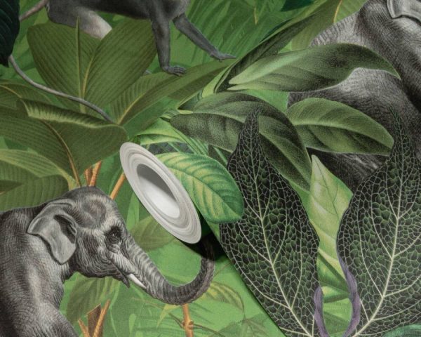 Medidas: 10,05 m x 0,53 m. Case: 64 / 32 cm (offset match). Calidad: Tejido no tejido. Estilo: Papel pintado estilo tropical de animales de la selva en color verde.