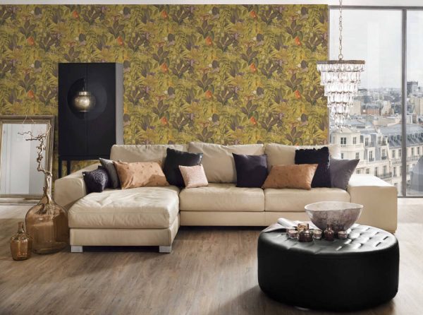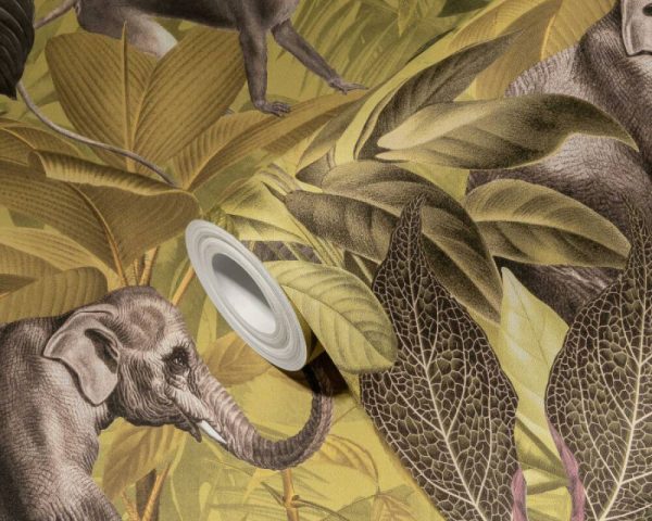 Medidas: 10,05 m x 0,53 m. Case: 64 / 32 cm (offset match). Calidad: Tejido no tejido. Estilo: Papel pintado estilo tropical de animales de la selva en color verde/amarillo.