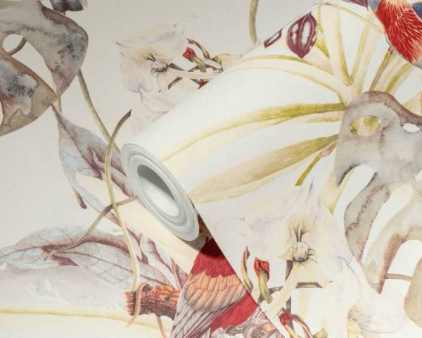 Medidas: 10,05 m x 0,53 m. Case: 64 / 32 cm (offset match). Calidad: Tejido no tejido. Estilo: Papel pintado diseño de loros sobre hojas de selva tropical en color crema y rojo.