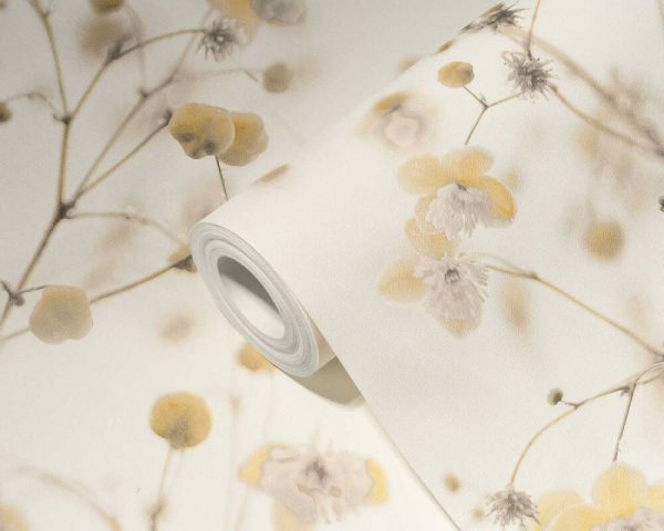 Medidas: 10,05 m x 0,53 m. Case: 64 / 32 cm (offset match). Calidad: Tejido no tejido. Estilo: Papel pintado floral diseño árbol en flor en color crema/amarillo.