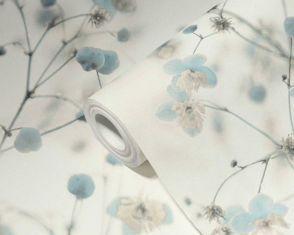 Medidas: 10,05 m x 0,53 m. Case: 64 / 32 cm (offset match). Calidad: Tejido no tejido. Estilo: Papel pintado floral diseño árbol en flor en color crema/azul.