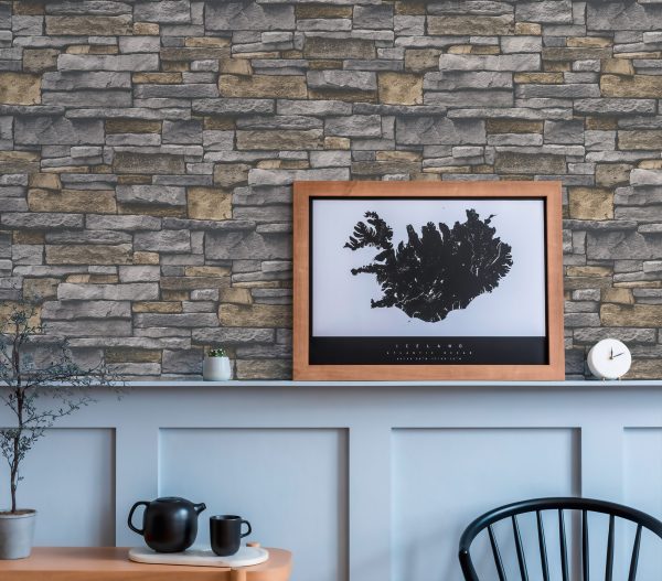 Medidas: 10,05 m x 0,53 m. Case: 64 / 32 cm (offset match). Calidad: Tejido no tejido. Estilo: Papel pintado efecto piedra en color gris y amarillo.
