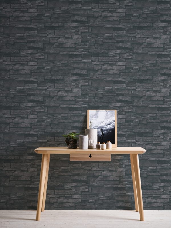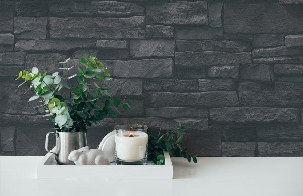 Medidas: 10,05 m x 0,53 m. Case: 64 / 32 cm (offset match). Calidad: Tejido no tejido. Estilo: Papel pintado efecto piedra en color negro.