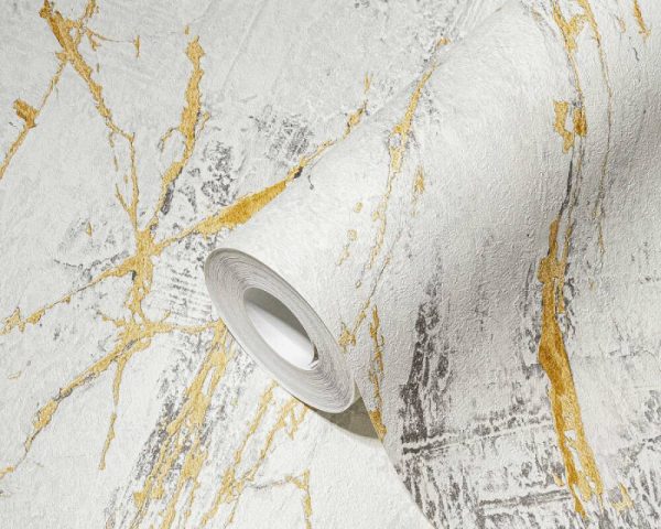Medidas: 10,05 m x 0,53 m. Case: 64 / 32 cm (offset match). Calidad: Tejido no tejido. Estilo: Papel pintado efecto mármol en color crema con la veta dorada. Acabado satinado texturado.