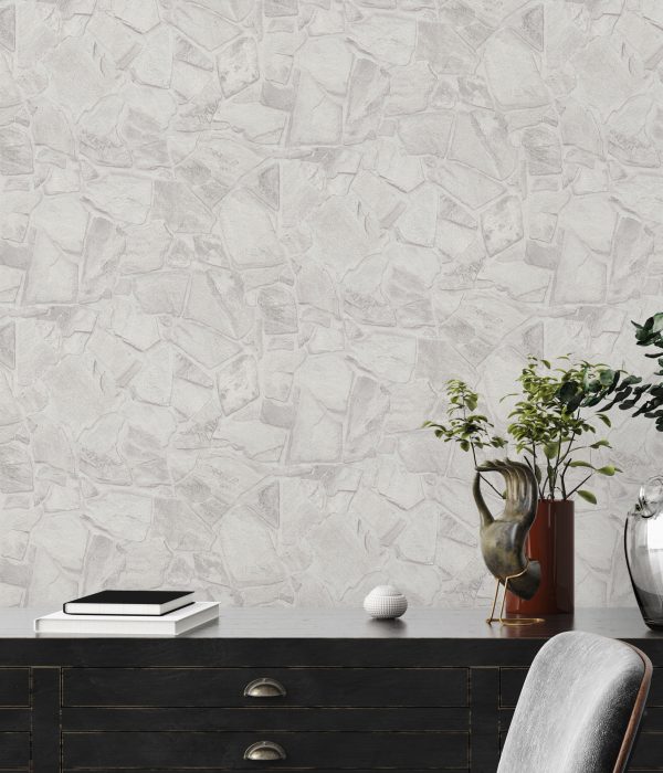 Medidas: 10,05 m x 0,53 m. Case: 64 / 32 cm (offset match). Calidad: Tejido no tejido. Estilo: Papel pintado efecto piedra en color gris y blanco.