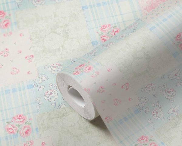 Medidas: 10,05 m x 0,53 m. Case: 26 cm (straight match). Calidad: Tejido no tejido. Estilo: Papel pintado diseño patchwork en color azul, rosa y crema. Acabado vinílico.