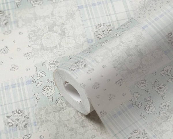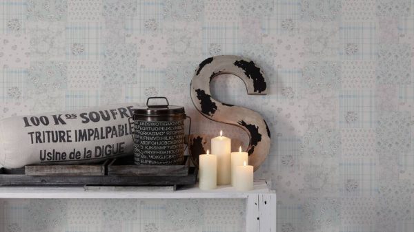 Medidas: 10,05 m x 0,53 m. Case: 26 cm (straight match). Calidad: Tejido no tejido. Estilo: Papel pintado diseño patchwork en color azul, gris y crema. Acabado vinílico.